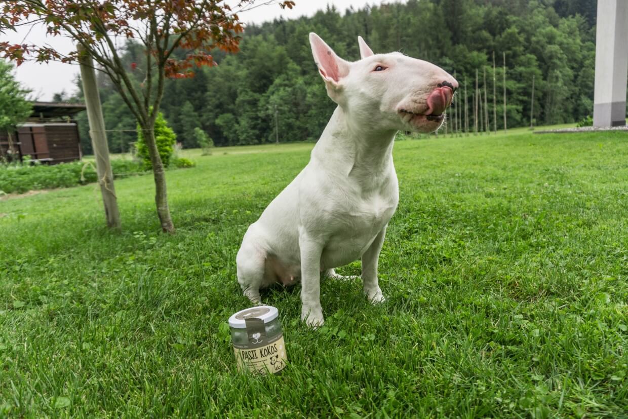 »Končno pa se je našel nekdo, ki je pomislil, da kar je dobro za nas, je morda dobro tudi za psa. Če povem čisto po pravici, se mi je zdelo tako finofajn, ko sem prvič slišala za Pasji kokos! In seveda je takoj pristal pri vrhu seznama želja. Za začetek sva poskusili z vzorčkom, a brez dvoma je Machi v trenutku obnorel in sva si morali narediti celo zalogo. Neverjetno, s kakšnim užitkom ga je lizala kot najljubši sladoed. In vsakič, ko ga dobi, kar odpotuje v drug svet. Da tega, koliko časa se po njem še oblizuje, sploh ne govorim. Mi ga uporabljamo predvsem kot prehransko dopolnilo, porabili pa smo ga tudi že za zaščito tačk. Ko sem ji namazala tačke, je bil to dvojni užitek, saj si je potem seveda morala obliznit vse tačke. Kljub temu pa se je mazilo že vpilo v tačke. Velikokrat ga dobi kot nagrado, z njim pa sva se lotili tudi raznih izzivov. Na začetku je bila zelo občutljiva na zvoke, ko pa sem ji ob poku štartne pištole dala Pasji kokos, sploh ni reagirala. Mislim, da bi se zanj prodala… 😉 in ko smo že ravno pri tem – njen stric Jaka jo je s kokosom nahecal, da mu je pokazala nekaj svojih veščin, ki jih obvlada. In ko mu je na koncu pritisnila lupčka, je malo začudeno in precej navdušeno rekel, kako finofajn diši po kokosu! Glede pozitivnih učinkov težko rečem, kaj natanko je posledica rednega uživanja kokosa, a resnično verjamem v to, da je dober za Machi. Ima čudovito svetlečo in mehko dlako, z alergijami nimamo težav, zobki so lepi in zdravi, ona pa je vesela ter aktivna psička. Delež tega vsekakor lahko pripišemo tudi Pasjemu kokosu.«